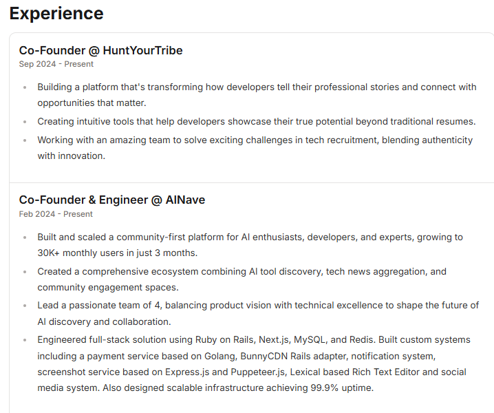 - Keep a builder log: Recruiters and clients love consistency. Keep your profile alive by documenting progress and even the small wins. That’s how you keep your profile dynamic, as the ability to document your startup journey in a smooth narrative is what sets you apart .